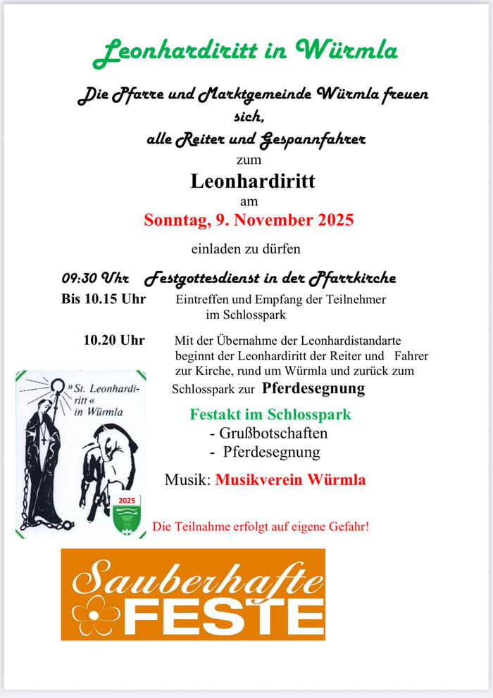 - 10:20 Uhr Mit der Übernahme der Leonhardistandarte beginnt der Leonhardiritt der Reiter und Fahrer zur Kirche, rund um Würmla und zurück zum Schlosspark zur Pferdesegnung